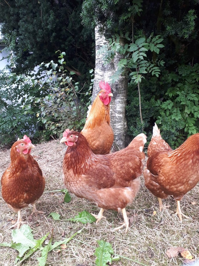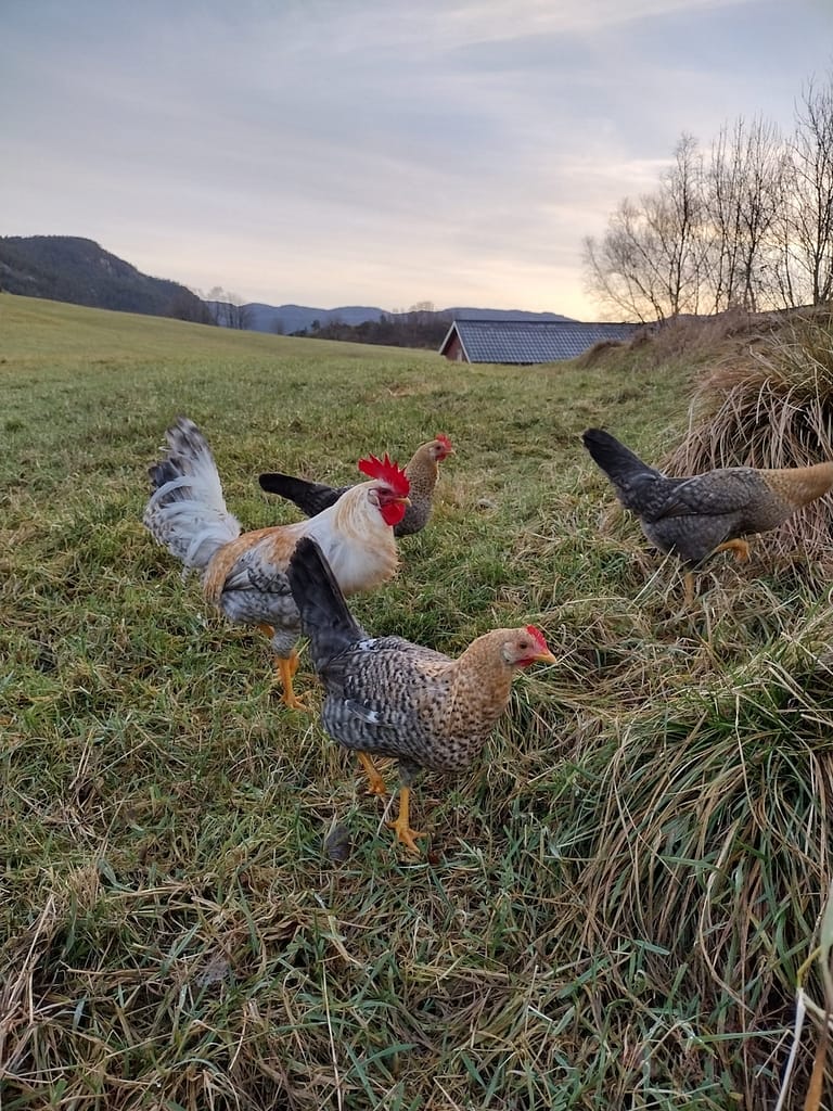 Vi har nokre høner og ein hane på Fossane gard. Hanen Kompis passer på hønene sine. Vi har nokre Jærhøns, den siste norske landrasen. Hønene gir oss egg kvar dag. Har vi nok egg så selger vi dei kanskje.